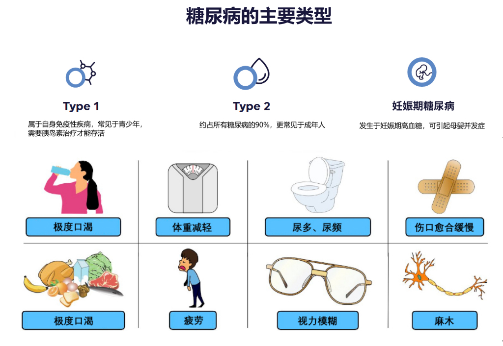 糖尿病主要癥狀包括:口渴多飲、多尿、體重減輕、視力模糊等。
