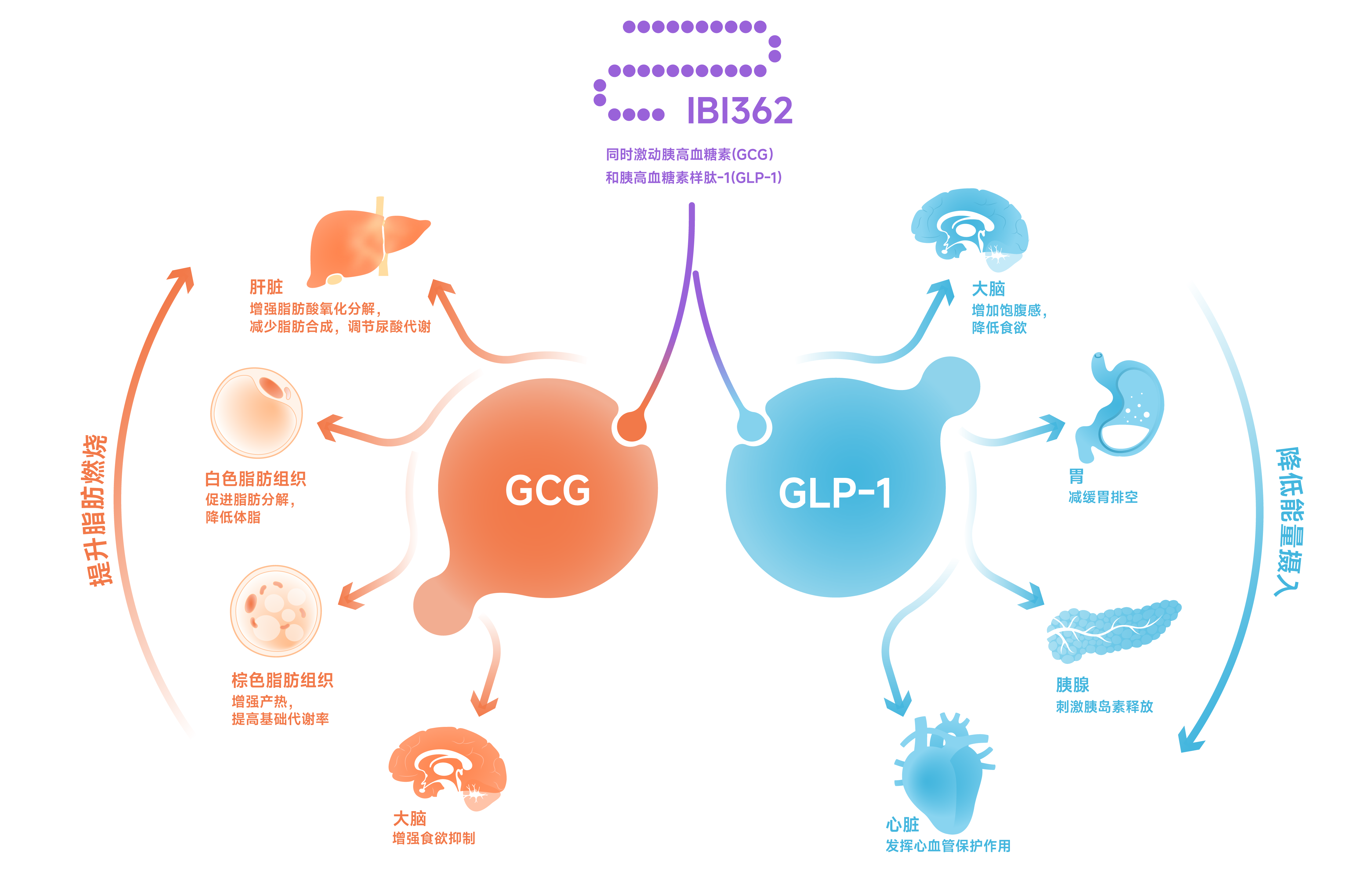 胰高血糖素(GCG)是一種由胰島α細胞分泌的激素,可通過促進糖異生和糖原分解來提高血糖濃度,除維持血糖穩(wěn)定外,胰高血糖素還參與氨基酸、脂質代謝以及能量的攝入和消耗。因此,胰高血糖素是一種具有多種生理作用和臨床意義的綜合代謝調節(jié)激素。胰高血糖素受體激動劑通過激活胰高血糖素受體(GCGR),抑制脂肪合成、促進脂肪分解和氧化,提高能量消耗并改善肝臟脂肪代謝,肝臟炎癥和纖維化,發(fā)揮“燃脂護肝”功能,進一步增加減重效果。