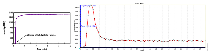 化學(xué)發(fā)光動(dòng)力曲線圖(圖左 輝光型;圖右 閃光型)