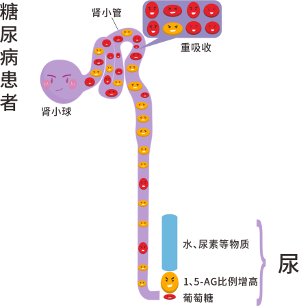 1,5-AG在腎小球中排出,卻被腎小管近99.9%重吸收【2】。這種重吸收機(jī)制與尿葡萄糖相同,當(dāng)腎小管上的尿葡萄糖過量時(shí),則1,5-AG的重吸收就會被競爭性抑制【4,5】。糖尿病患者在高血糖狀態(tài)下終尿排泄的1,5-AG增加導(dǎo)致了血清的1,5-AG減少。