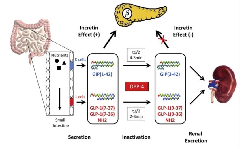 腸促胰素肽(Incretin peptides)[4]是進食后由腸道的內(nèi)分泌細(xì)胞分泌的激素,促進機體產(chǎn)生適當(dāng)?shù)牟秃笠葝u素分泌。