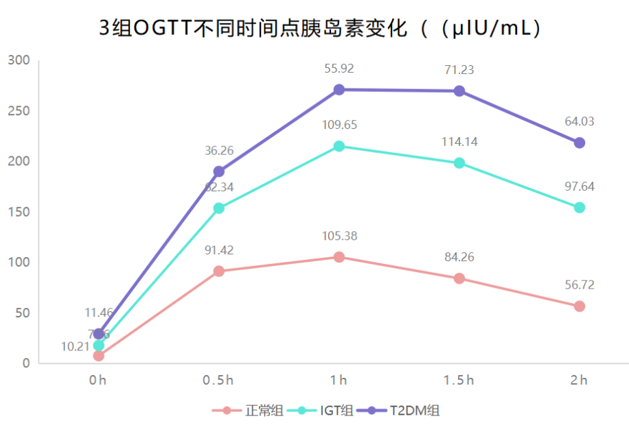 正常組胰島素平均最高值在糖負(fù)荷后1h,IGT組和T2DM組均延后,平均最高值出現(xiàn)在1.5h。T2DM組在各時點平均胰島素均低于正常組,在0.5h、1h、1.5h和2h的平均胰島素均低于IGT組,IGT組在0.5h低于正常組,在1h、1.5h和2h均高于正常組,差異均有統(tǒng)計學(xué)意義(P<0.05)。