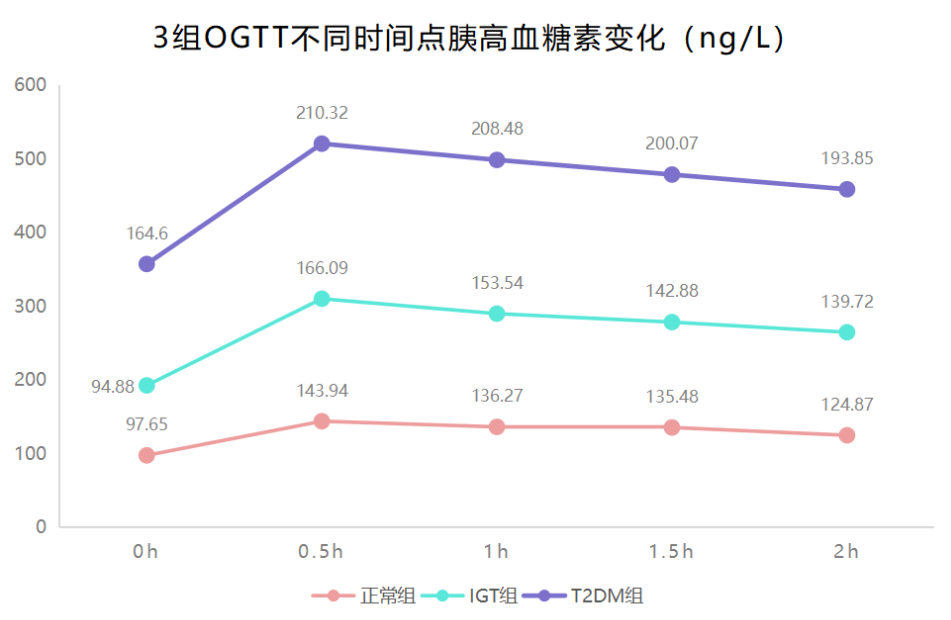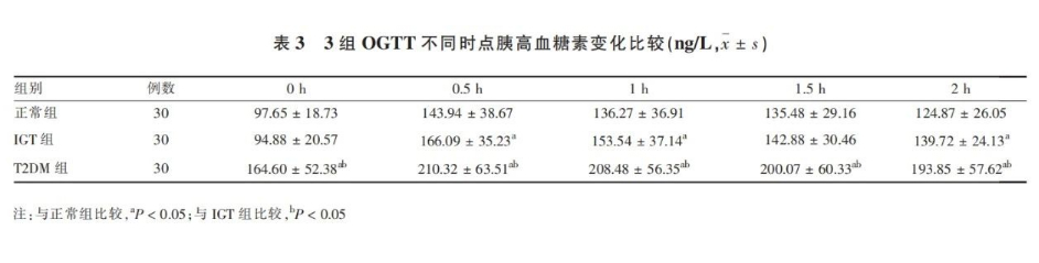 T2DM組在各時點,IGT組在0.5h、1h、1.5h、2h的平均GLP-1低于正常組,T2DM組在0.5h、1h、1.5h、2h的平均GLP-1低于IGT組,組間差異有統(tǒng)計學(xué)意義(P<0.05)。