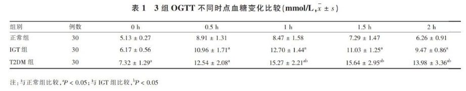 1、3組OGTT不同時點血糖變化如表1、圖1所示