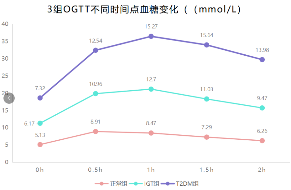 T2DM組在各時點平均血糖均高于正常組,在1h、1.5h和2h的平均血糖均高于IGT組,IGT組在0.5h、1h、1.5h和2h的平均血糖均高于正常組,差異均有統(tǒng)計學(xué)意義(P<0.05)。