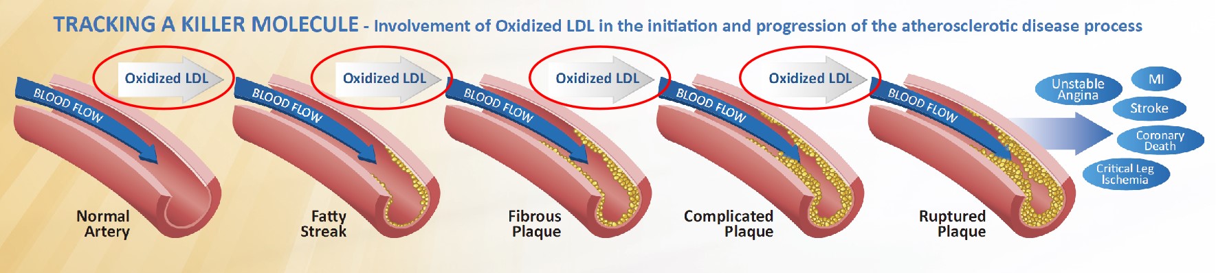氧化低密度脂蛋白(ox-LDL)是低密度脂蛋白(LDL)的致動脈粥樣硬化形式,它是一種斑塊特異性脂蛋白,在動脈粥樣硬化疾病過程中起著關(guān)鍵作用。氧化型低密度脂蛋白主要存在于動脈粥樣硬化斑塊中,而非正常動脈中,它直接參與動脈粥樣硬化的發(fā)生和發(fā)展:從單核細(xì)胞/巨噬細(xì)胞早期轉(zhuǎn)化為泡沫細(xì)胞,到斑塊不穩(wěn)定和破裂的晚期階段。