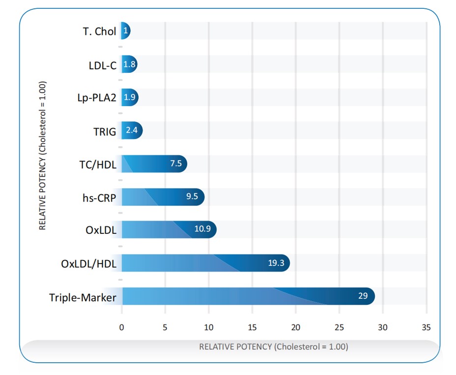 美國Shiel醫(yī)學(xué)實(shí)驗(yàn)室所做的生物標(biāo)志物對冠狀動脈疾病患者的相對有效性研究表明,將總膽固醇(T.Chol)對于心血管事件的有效性定義為1,則LDL-C為1.8,ox-LDL為10.9,ox-LDL三聯(lián)檢(ox-LDL / HDL * hs-CRP)為29,ox-LDL檢測的有效性大幅提升。
