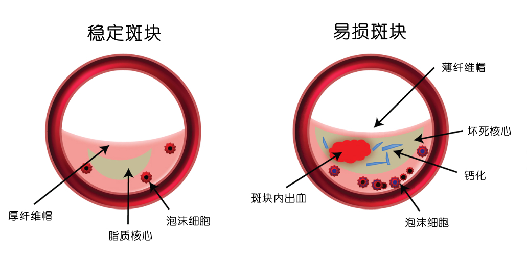 易損斑塊(不穩(wěn)定性斑塊)的破裂是急性冠脈綜合征(acute coronary syndromes,ACS)發(fā)生的重要始動因素。易損斑塊也稱“高危斑塊”,指的是不穩(wěn)定、易于破裂和形成血栓而導致急性心血管事件或死亡的斑塊。其主要的病理學特征包括:大脂質核心、薄纖維帽、伴巨噬細胞浸潤、正性重構、斑塊內新生血管生成和斑塊內出血等。