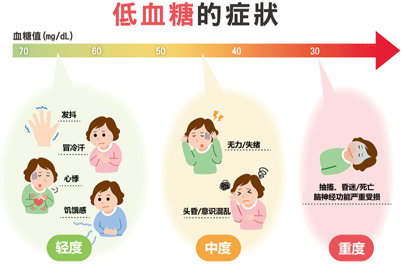 如果說高血糖的危害是以年來計算的,那么低血糖的危害則是以小時來計算的。輕度低血糖可引起交感神經興奮,出現(xiàn)饑餓感、頭昏眼花、心慌手顫、面色蒼白、出冷汗、虛弱無力等癥狀,而嚴重低血糖則可引起驚厥、昏迷甚至死亡。