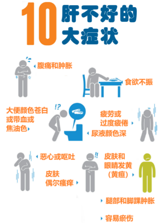 肝不好的癥狀表現(xiàn)主要包括乏力、厭油膩、消化不良、腹脹、肝區(qū)隱隱不適、面色晦暗、皮膚出現(xiàn)毛細血管擴張、尿色變黃、精神較差、體重下降、營養(yǎng)不良等。